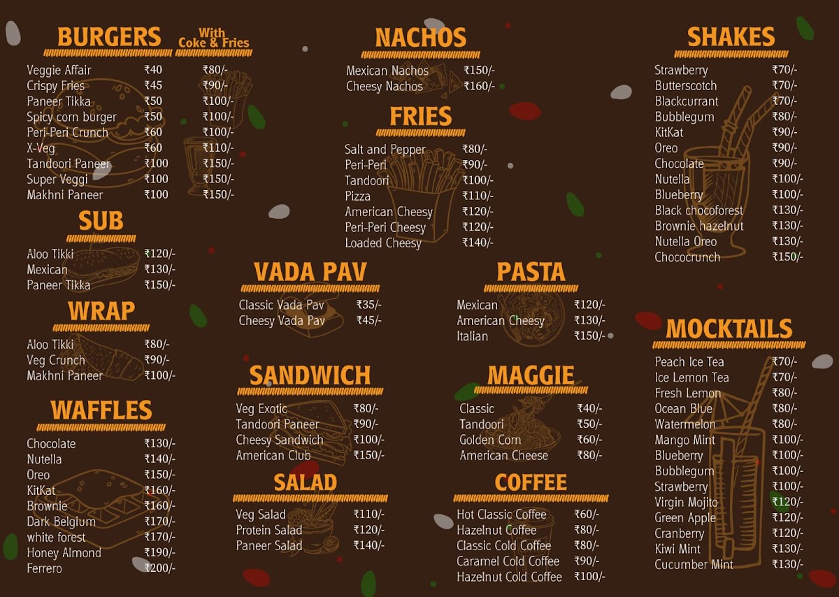 Highlights include their enticing special combos like Brownie With Ice Cream, Maggie + Coke + Fries, and Pasta + Coke + Burger. For a quick snack, their crispy and creamy Spring Rolls are a must-try, while wraps such as Aloo Tikki and Makhni Paneer offer delightful vegetarian options.